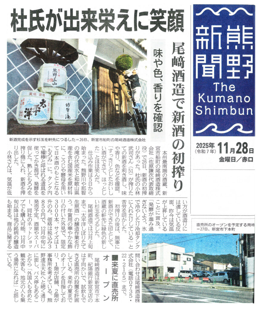 2025年11月27日の熊野新聞に「新酒の初搾り」について掲載していただきました。